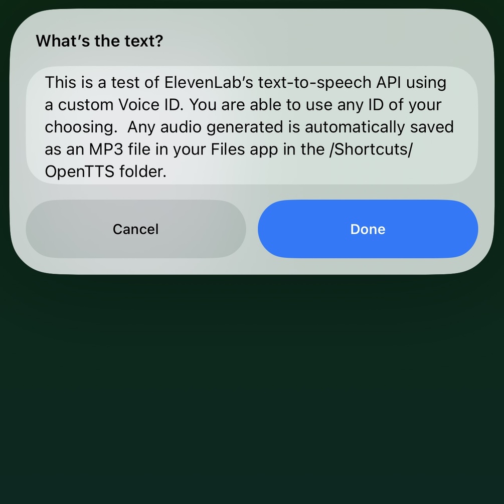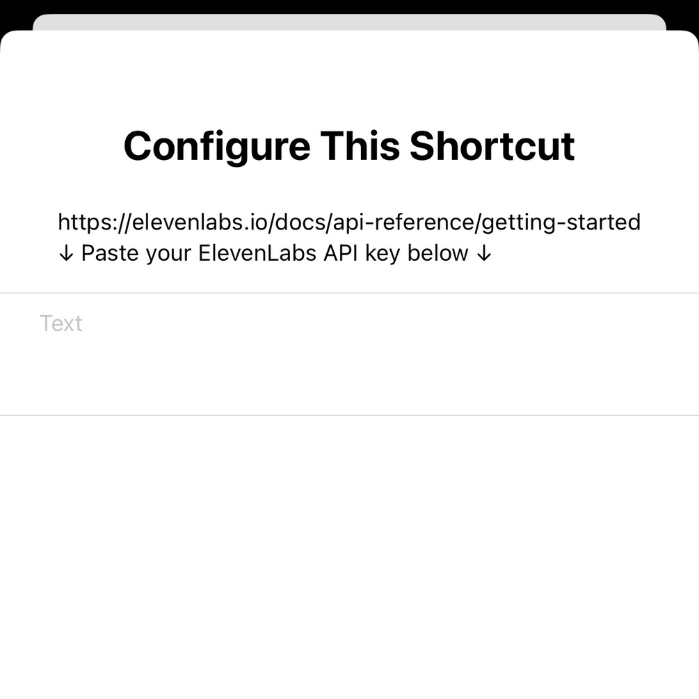 This iOS Shortcut calls the ElevenLabs's models using your own personal API key and Voice ID of your choosing.